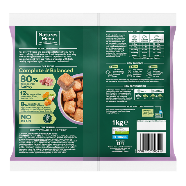 Superfoods aren’t just for humans! These complete and balanced, raw single protein nuggets are packed with 80% farm reared turkey as well as 20% specially selected fruits and vegetables. No grain. Chicken free. Pack size 1kg. Approximately 58 nuggets per pack.