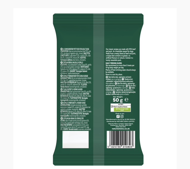 Natures Menu , meaty treats 95% beef & pork 50g e